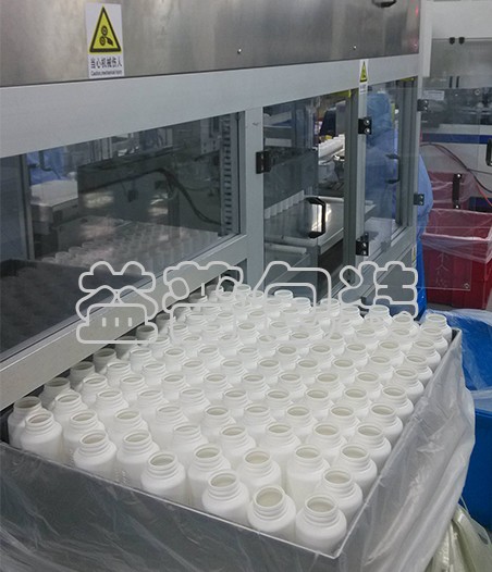 產(chǎn)品由進(jìn)瓶輸送線送入排瓶推移工位,排瓶推移機(jī)構(gòu)將整排推入排瓶臺(tái)。達(dá)到設(shè)定的行列數(shù)時(shí),抱夾升降平移機(jī)械手將整層瓶抱夾裝入周轉(zhuǎn)箱中的塑料袋內(nèi)。裝滿設(shè)定的層數(shù)后,人工將套好袋的空周轉(zhuǎn)箱推入裝袋工位,同時(shí)滿箱將推至取出工位,工人完成封口后將滿袋取出。并重新套上空袋。周轉(zhuǎn)箱套袋、滿袋封口及從周轉(zhuǎn)箱取出由人工完成,只需一人操作。
